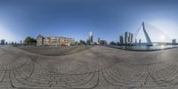 A mesmerizing fish-eye view of a European city. The cityscape is reflected in a circular image that captures the essence of the metropolitan area. Modern architecture, high-rise buildings, and a cable-stayed bridge add to the urban design.