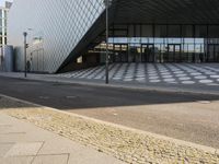 The Futurium in Berlin, Germany showcases modern architecture with a facade of small windows and metal walkways. The clear sky casts shadows on the urban design, while contrails streak across the glass walls. A futuristic cityscape in Europe.