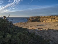 At the crack of dawn, a person stands on a cliff at the ocean shore, observing the vast expanse of azure water. A pristine coastline dotted with cliffs and vegetation captures the beauty of Portugal's coastal landscape.