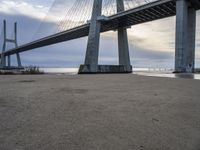 This image captures a view of a bridge from underneath, with people walking on the sandy surface below. The bridge is located in Lisbon, Portugal, providing a picturesque view of the coastal city and the ocean. The open space under the bridge is surrounded by tints and shades of composite materials, creating a unique and modern atmosphere. The bridge stands out against the clear sky and the water surface, adding to the overall beauty of the scene. This photo perfectly represents a day in Lisbon, showcasing the city's coastal charm and its architectural wonders.