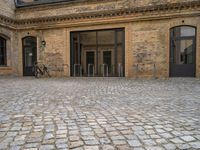 This image depicts a classic brick building in Berlin, Europe. The building's facade showcases the timeless architecture of the city. In front of the entrance, a bike is parked, with its chain secured to the wall. The cobblestone sidewalk adds to the charm of the surroundings. The image captures a sunny day in Berlin, with pedestrians strolling by and enjoying the public space. The Hinterhof, or courtyard, reveals a glimpse of the open space and warehouse behind the building. This photo celebrates the diverse architecture and vibrant atmosphere of Berlin.