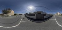 a fish - eye view of a building in the road from the intersection with street cars