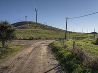 This image showcases a rural landscape in Europe, specifically in Portugal. The clear sky provides a beautiful backdrop to the natural environment, featuring sand streets, dirt roads, and sloping terrain. The land lot is covered in grass and vegetation, with a windmill and wind turbines visible in the distance. Overhead power lines stretch across the landscape, providing electricity to the area. The surface of the roads and land is a mixture of gravel and sand. This photo captures the beauty of the highlands in Portugal, representing a peaceful day in the countryside.
