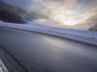 A dramatic winter landscape in the European highlands. The sun peeks through the fog and snow, creating a breathtaking atmosphere. The car drives along a mountain road, surrounded by snow-covered mountains and a wet horizon.