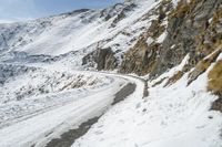 A thrilling ride down the snowy slopes of a mountain in Europe. The snow-covered terrain creates a freezing atmosphere, contrasting with the clear blue skies. The majestic rock walls add to the picturesque landscape.