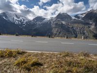 This image captures a scenic road in Austria, surrounded by snow-capped mountains. The clear sky adds to the stunning landscape of Europe. On the side of the road, a motorcycle is parked, highlighting the sense of adventure and nature. This photo represents a beautiful day on the road, showcasing the majestic mountains and the natural beauty of Austria.