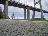 This image showcases a city park in Lisbon, Portugal, set underneath a concrete bridge. The park offers an open space with lush vegetation and recreational areas for people to enjoy. The composite material bridge spans over a road, providing pedestrians with a better fit through the roadway. The gloomy grey sky and cloudy coastline create a serene atmosphere, while the underpass allows easy access to the park's greenery and the nearby ocean. This photo captures the symmetry between the urban infrastructure and the natural landscape, making it a unique sight in Europe.