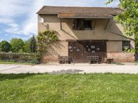 This is an image of a house surrounded by a fence in a grassy field in Germany. The clear sky above sets a peaceful backdrop for the lush landscape. The rural setting showcases the beauty of nature and agriculture in Europe. A road made of concrete and gravel leads up to the house, providing access to the home and other structures such as the barn and shed. This photo captures the tranquility and simplicity of rural living in Germany.