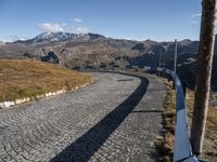 This image captures a narrow cobblestone road in Austria, winding its way through a stunning mountain landscape. The road is flanked by Armco barriers and guard rails for safety. In the distance, snow-capped peaks can be seen against a clear sky, adding to the picturesque nature of the scene. This photograph represents the natural beauty and charm of Europe. It serves as a reminder of the tranquil and scenic roads that can be found in Austria.