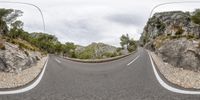 A scenic road in Mallorca, Balearic Islands, Europe. The asphalt curves through the picturesque landscape, passing by rock walls and Armco barriers. Low clouds add drama to the straight and S-curves. A perfect day for nature enthusiasts.