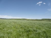 a green meadow with blue sky behind it and a white clouds in the background to the left of it