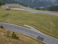 there are two motorcycles riding on a winding mountain road on a cloudy day in europe