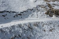 A stunning mountain landscape in Europe. A snow-covered road winds through the elevated terrain, surrounded by majestic mountain ranges and glacial ice caps. Nature's garden of high slopes and rocky trails.