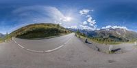 a fish eye view looking down the mountain road, with a view of the mountain range through the lens