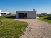 A modern residential villa in Holland, Netherlands. The villa is surrounded by open space and vegetation. The empty building sits on a grassy area beside a road with gravel in front of it.
