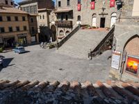 This is an image of a charming European village in Tuscany, Italy. The top-down view captures the classic architecture and cobblestone roads that wind through the town. The open spaces include plazas with high flooring and rooftops, where cafes and restaurants are elevated for outdoor seating. The urban design blends seamlessly with the surrounding valley, creating a picturesque scene. Visitors can enjoy the unique charm of this village, with its quaint streets and beautiful gardens. This photo represents the perfect place to eat out and relax in Tuscany.