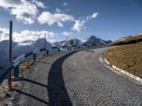 A scenic mountain road in Austria, winding through beautiful European landscapes. The clear sky accentuates the natural beauty of the surroundings. The cobblestone road adds charm to the picturesque scenery.