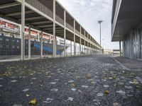 This is an image of a paved walkway with parking spots in the city of Lisbon, Portugal. The cobblestone road stretches straight ahead towards the harbor, where boats are docked at the pier. Above, the clear blue sky contrasts with the clouds. This photo represents metropolitan urban design and captures a typical day in Lisbon. The city's landmarks and vibrant atmosphere make it a popular destination in Europe.