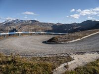 This image showcases the beautiful landscape of Austria in Europe. The clear sky provides a stunning backdrop to the winding road with its cobblestone surface. Along the path, there is an Armco barrier and a blue railing, which guide the vehicles and pedestrians safely. The view extends to the majestic snowy mountains in the distance, creating a seamless connection between nature and the road. This photo captures the essence of a day in Austria, where the open spaces and switchbacks offer a unique driving experience in the midst of breathtaking scenery.