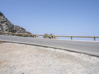 A clear sky frames the scenic landscape of Mallorca, Spain. A skateboard leans against a metal guard rail along a winding road, adding a touch of adventure to this picturesque European road trip.