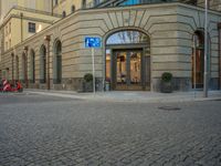 a picture of the entrance to a building in a city street area with two motorcycles in front of the entrance