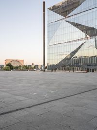 A modern architecture building in Berlin's business district. The glass facade reflects the clear sky, creating a striking contrast. The concrete surfaces and sleek design showcase Europe's urban design at its finest.