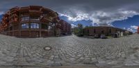 Urban design in Europe, capturing modern architecture in Berlin's residential area. Multicolored brick walls line the cobblestone road leading to a courtyard. Hard shadows create a dramatic profile against the clear day sky.