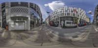 an image of a fish eye lens looking down the street in front of a building