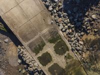 This aerial image captures the beautiful coastline of Portugal, with an urban landscape in the foreground. The top-down view highlights the intricate patterns of the city streets and open spaces. The landscape features grass, trees, and wood elements, providing a natural touch to the concrete and asphalt surfaces. In the distance, the ocean stretches out, creating a serene backdrop. Along the coast, there is a boat ramp for easy access to the water. This photo represents the seamless integration of nature and urban design in Portugal.