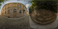 A charming alley-way in a European village. Classic architecture and cobblestone roads create a picturesque scene. The reflection of a building is captured in a circular street mirror.