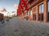 Early dawn in Berlin's residential area, showcasing modern architecture with brick walls and cobblestone roads. Urban design blends with historic European architecture. A courtyard surrounded by warehouses and storerooms epitomizes city life.