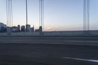 This is a photo of a city skyline during sunrise. The clear sky is filled with sunshine, creating a vibrant atmosphere. The metropolitan area is dotted with high-rise buildings and office buildings, showcasing the urban landscape. The road surface and asphalt lead to a bridge spanning across the city, creating a sense of motion and connection. The horizon is defined by the line of the high-rise buildings and the sun visible in the sky. This image captures the energy and beauty of a city at the break of day.