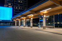 a bus station is at night by some buildings with lights on it's pillars