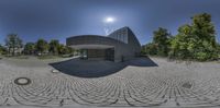 360 - vision image of the exterior of a museum, with bikes parked in the driveway