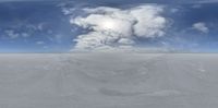 Vast open salt flats under a sunny skydome. Sun shines brightly over the endless desert landscape, with occasional clouds visible. A tranquil, sunny day at the salt flat and salt lake region.