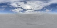 An endless salt flat landscape with the sun shining brightly. Open spaces provide a serene desert environment with visible clouds enhancing the skydome. Ideal for those seeking a unique sunny day adventure.