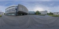 A view of a modern office building in Berlin's financial district. The building features unique architecture with an inverted circular roof. The clear sky provides a striking backdrop to the urban design of the city.