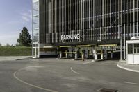 A modern office building in Toronto's financial district. Clear skies highlight the sleek urban architecture. The asphalt road and surrounding vegetation add a touch of green in the bustling city center.