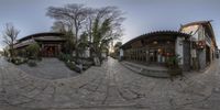 A fisheye view of an old building on a cobblestone road. The classic architecture and historic facade add charm to this residential area. The clear sky and autumn foliage create a picturesque scene in this old town.