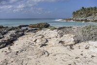 A picturesque coastal landscape in Florida, with sandy beaches stretching along the azure ocean. The open space is dotted with trees and vegetation, providing a natural environment for exploration and relaxation. Rocky cliffs and bedrock formations add to the unique terrain.