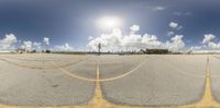 the view of a parking lot with clouds and sunshine in the background, with yellow lines