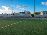 empty football stadium with green grass and bleachers at sunset and high rise buildings