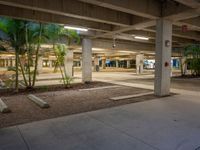 a concrete parking garage with concrete planters and gravel on the ground inside it is shown in image