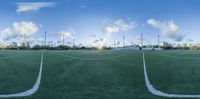 A sunny day in Miami Beach, Florida. A green soccer field sits near residential houses, with clouds in the sky. Hard shadows create a dramatic effect. The perfect setting for a football match.