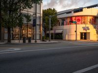 This is an image of an empty street in Miami Beach, Florida at dusk. The city buildings stand tall in the background, emphasizing the urban atmosphere of the area. The road is made of asphalt, and the storefronts of various shops are visible along the street. The sun is setting, creating a warm, sunny glow that adds a touch of romance to the city scene. This photo captures the urban design and vibrant city life of Miami Beach at the break of day.