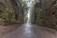This captivating image captures the essence of Tenerife, Spain's natural beauty. A straight road, surrounded by lush green forest and vegetation, leads towards a stunning waterfall. The road, made of smooth asphalt, cuts through the landscape, providing a recreational path for adventurers. The atmosphere is enhanced by the low fog and haze, creating a gloomy and mysterious ambiance. The grey sky adds to the unique charm of this European destination. This photo perfectly showcases the harmonious blend of nature and infrastructure found in Tenerife, Spain's majestic natural environment.