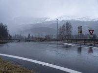 This image captures a wet roadway in the French Alps, Europe. Surrounded by mountains and trees, the road surface is covered with rainwater, creating a reflective and slightly hazardous condition for drivers. In the background, a snowy mountain range adds to the scenic beauty of the landscape. The foggy atmosphere adds a sense of mystery and depth. This photo represents a winter day in rural France, highlighting the infrastructure and thoroughfare that connect various highland areas.