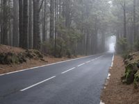 A car traveling down a foggy road between trees in a forest on a misty day in Tenerife, Spain. The asphalt road winds through the lush landscape, surrounded by tall trees and a dense forest. The wet road surface reflects the grey sky, creating a gloomy and emotional atmosphere. The fog adds an element of mystery to the natural environment, shrouding the scene in a haze. This rural road in Tenerife showcases the beauty of the island's woodlands and highlights the infrastructure that connects different parts of the island. Explore the serene and captivating countryside of Tenerife with this captivating stock photo.