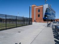 a baseball field with an empty field and seating by a fence and building behind the baseball stadium