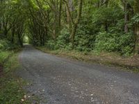an old empty roadway with green shrubs and trees around it and a yellow umbrella hanging from the handle